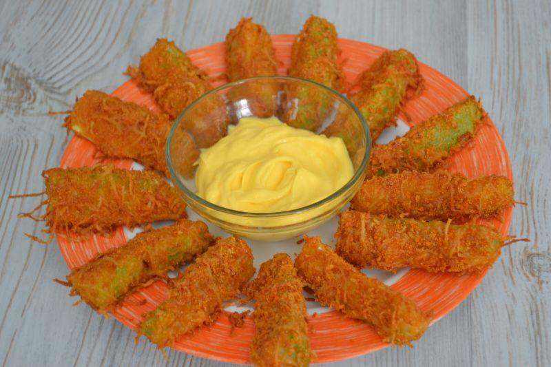 Спочатку кабачкові палички обвалюємо в борошні, потім в яйці, після кожний брусочок паніруємо в суміші із сухарів та сиру.