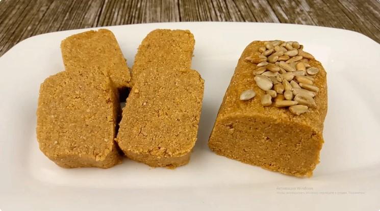 Цей десерт на смак справді нагадує халву. Вона солодка, поживна з приємним присмаком смаженого арахісу та соняшникового насіння. Халва не розлазиться, шматочки добре тримають форму.