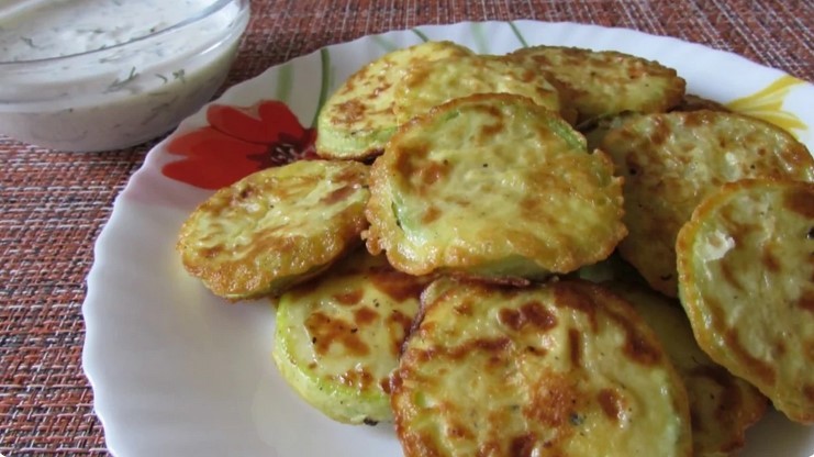 Вмочити кабачки в клярі, смажити на середньому вогні, на сковорідці з соняшниковою олією, з двох сторін, під кришкою, по кілька хвилин з кожного боку.