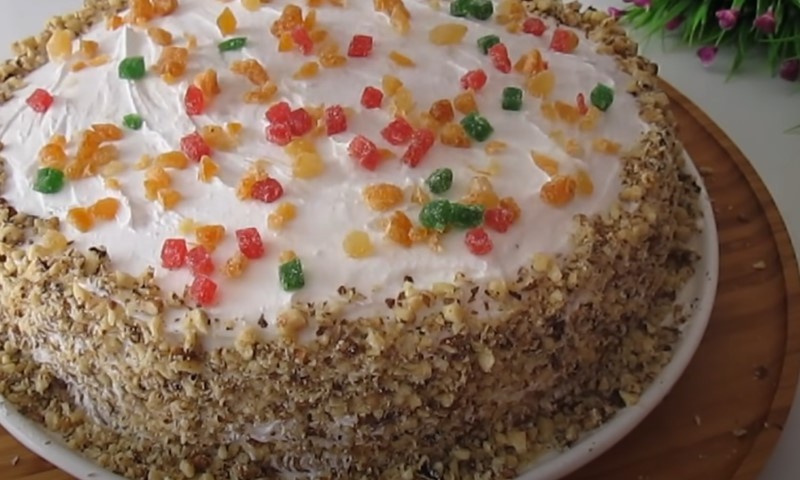 Кремом, що залишився, змастіть поверхню торта. Потім прикрасити краї подрібненими волоськими горіхами і посипати поверхню подрібненими цукатами (за бажанням). Залиште торт остигати в холодильнику на кілька годин.
