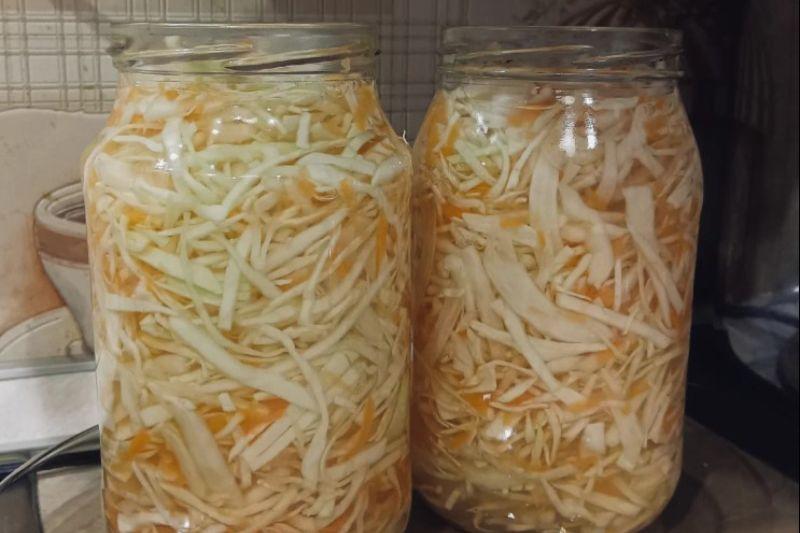 От і все! А за три дні можна куштувати нашу капусту. І до речі, за три дні закриваємо кришками банки і ставимо в холодильник. Чим довше стоїть така капуста, тим смачнішою вона стає.