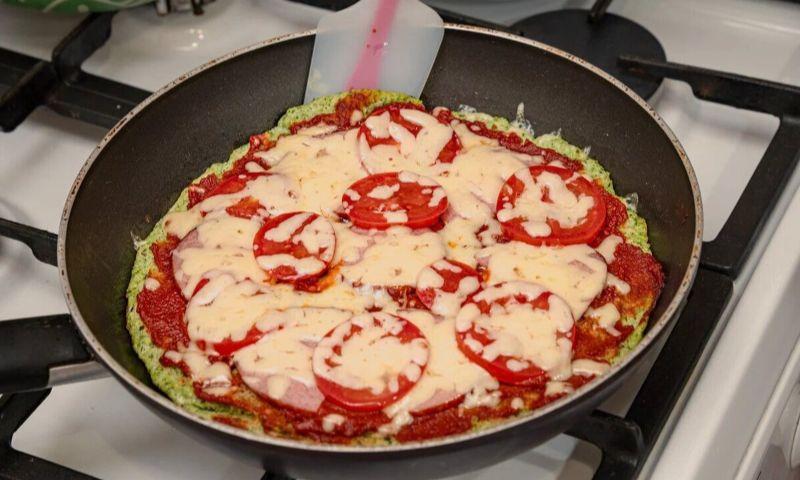 Викладаємо на розігріту сковороду приготовану овочеву суміш, рівномірно розподіляючи її по всій поверхні сковороди. Прикриваємо кришкою та обсмажуємо основу піци на середньому вогні протягом 8-10 хвилин.