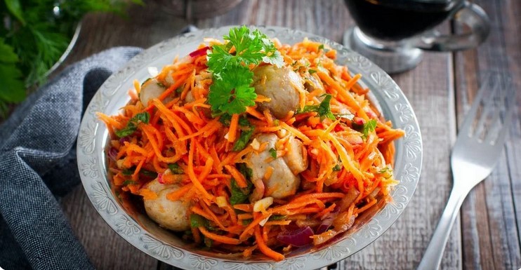 На сковорідці розігріти до високої температури олію (не до кипіння!), влити в моркву, додати оцет, соєвий соус, перемішати. Додати дрібно порізану зелень і гриби, перемішати. Прибрати в холодильник на 12-24 години. Чим довше буде салат маринуватися, тим більш насиченим буде смак!