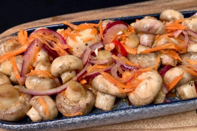 Беремо будь-яку ємність або контейнер і перекладаємо туди гриби. До них відправляємо дрібно нарізаний часник, червону цибулину пір’ям, моркву, натерту на “корейській” тертці і кілька кілець гострого чилі (якщо любите гостреньке).