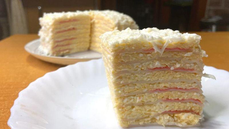 5. Настав час збирати тортик! Для цього кладемо розгорнуту крабову паличку на тарілку, зверху викладаємо сирну начинку та акуратно розподіляємо її тонким шаром. Потім знову кладемо паличку та начинку, паличку та начинку… І так далі, доки не закінчаться палички чи начинка.