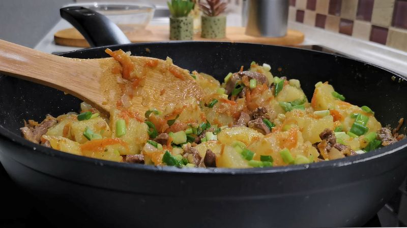Смажимо все ще 1 хвилину, по суті просто добре змішуємо. І потім викладаємо в сковороду підготовлену картоплю. Знову обсмажуємо 1 хвилину, і на цьому все. Залишається тільки заправити цю красу зеленню і подавати. З зелені найбільш підходящою, на мій погляд, буде зелена цибуля.