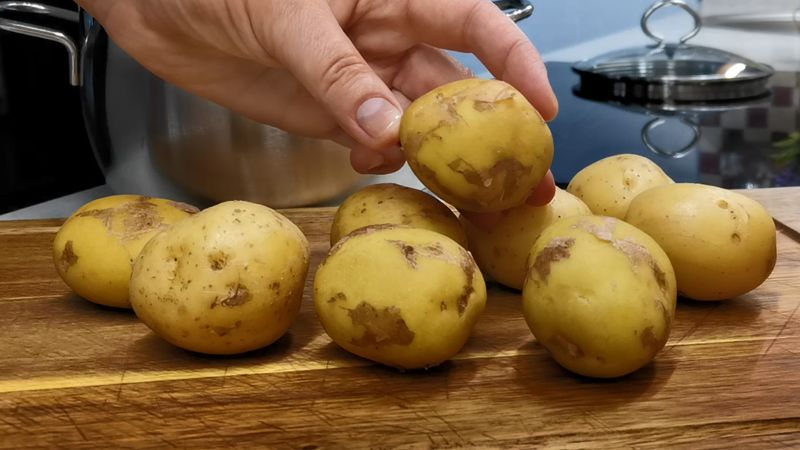 На фото у мене картопля молода, тому я її гарненько поскребла, щоб далі готувати зі шкіркою. Саме в цьому класна фішка. Але зараз молодої картоплі ще нема. Тому як звариться, якщо комусь не подобається така ідея, можна і почистити. Хоча я навіть із зимової картоплі шкірку все одно не знімаю. Є в незнятій шкірці своя краса. Хто любить, той зрозуміє.
