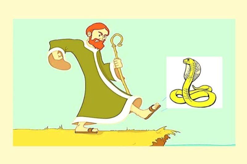 На одному лузі жила отруйна змія і нападала на всіх, хто проходив через цей луг. Усі люди її боялися і обходили це місце. Якось через цей луг зібрався йти якийсь святий, і люди розповіли йому про отруйну змію. Святий посміявся з них і сказав, що впорається з цією проблемою.