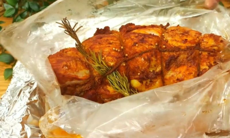 Потім дістаю м’ясо з духовки та розрізаю пакет. Поливаю рулет соком, що утворився, і відправляю в духовку запікатися, при температурі 220 градусів, до золотистої скоринки. Духовки у всіх різні і час може значно відрізнятися, тому орієнтуйтесь на духовку.