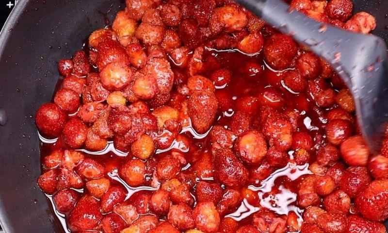 Засипте полуницю в каструлю і варіть на середньому вогні протягом 5-8 хвилин періодично помішуючи. Полуниця розм’якшиться і виділить сік.