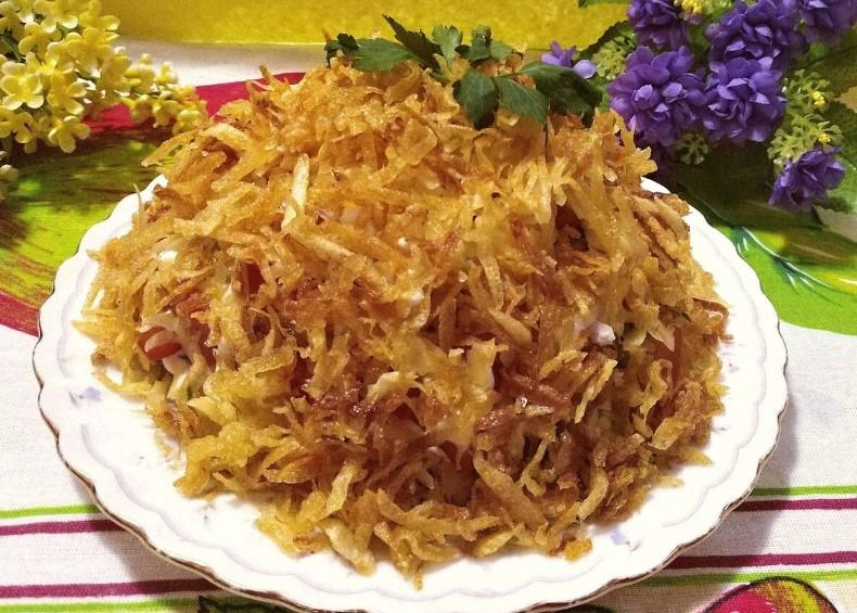 2/3 помідорів – майонезу. Всі овочі трохи присолюємо. Далі 2/3 сиру – майонез. Після цього шари повторюємо, зверху викладаємо обсмажену картоплю. Салат формуємо таким чином, щоб вийшла гірка, яка нагадує мурашник.