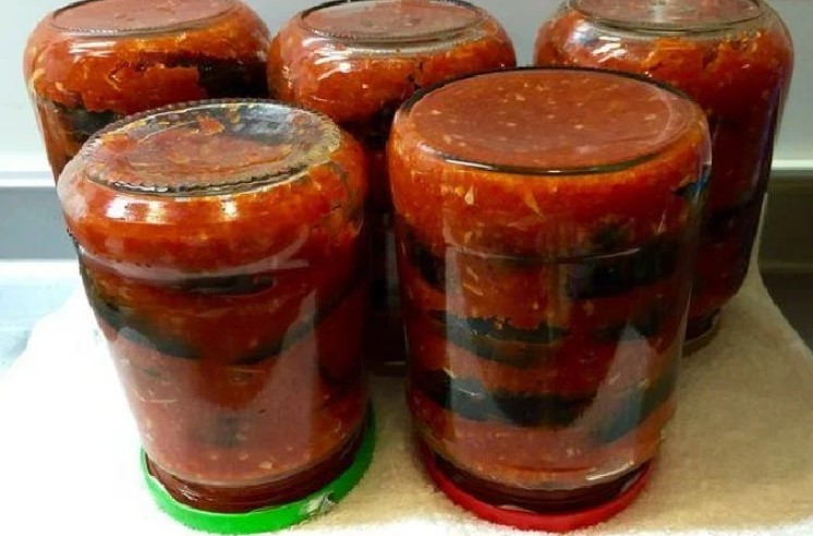 Заправку перемішати і поставити варитися на 20 хвилин, періодично помішуючи. Потім в стерильні банки вкладати баклажани шарами переливаючи кожен шар заправкою.