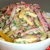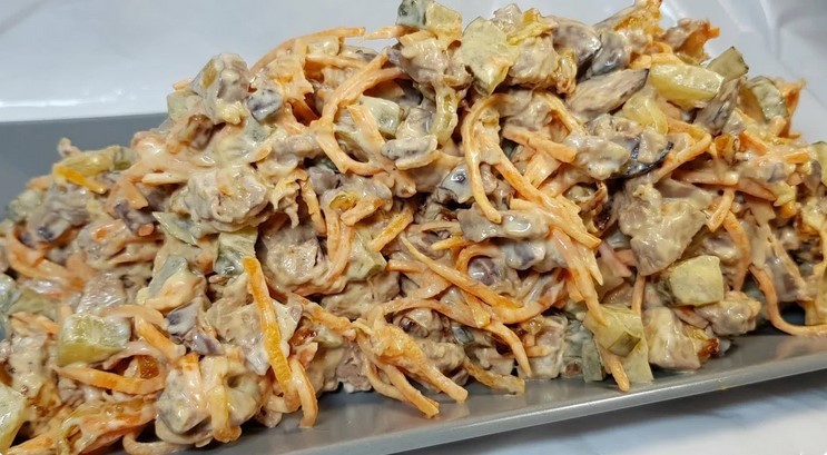 Дуже смачний і ситний салат, прекрасне рішення для сімейної вечері, а так само для святкового столу!