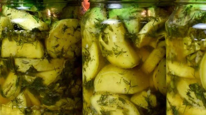 Ці кабачки за смаком нагадують мариновані грузді. Виходять кабачки хрусткі, ароматні, в міру кисло-солодкі, в міру гостренькі. Завдяки тому, що кабачки самі по собі мають нейтральний смак, з них можна зробити хоч варення, хоч компот, хоч різні види маринадів. У даному рецепті через велику кількість зелені, особливо кропу, кабачки набувають смаку маринованих грибів.