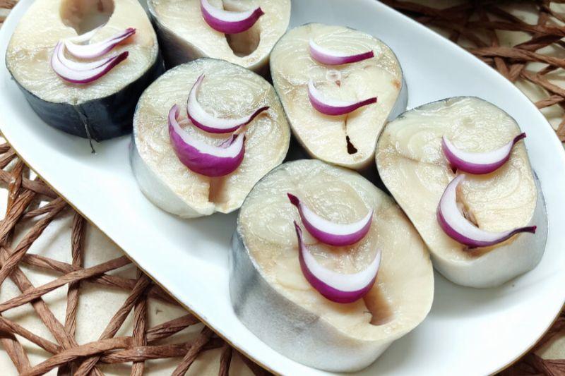 Я нарізаю скумбрію, яка починає трохи підтаювати, не розморожуючи до кінця, на шматочки приблизно 3 см завтовшки. З підмороженої скумбрії шматочки виходять акуратні та чиститься риба краще.
