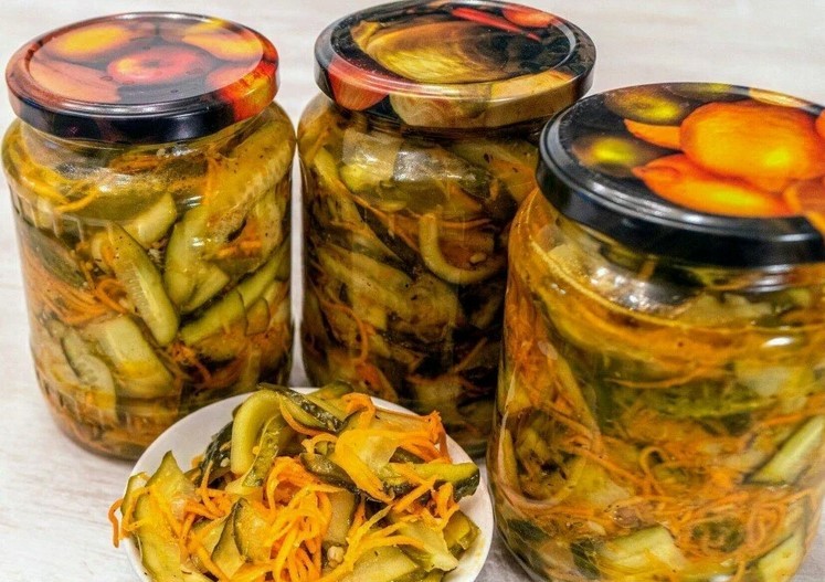 Моркву почистити, натерти на тертці для моркви по-корейськи. Порізати огірки. З’єднати підготовлені овочі з маринадом, перемішати і дати постояти 1 годину.