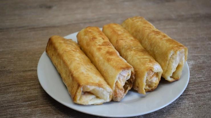 У тарілку розбиваємо два яйця та збиваємо їх вилкою. Вмочуємо в яйця трубочки з начинкою і смажимо на сковороді, на олії, на повільному вогні, до рум’яної скоринки.