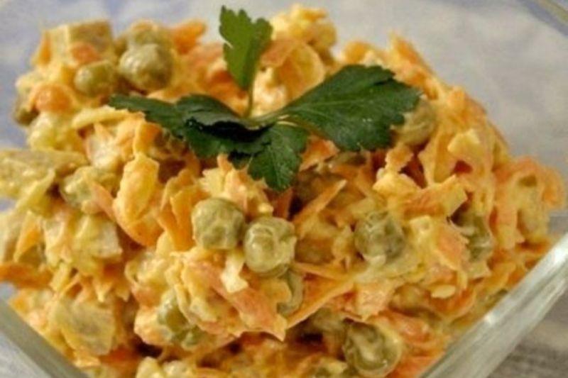 У салатник викладаємо м’ясо, моркву, цибулю. Додаємо зелений горошок. Солимо на смак і заправляємо майонезом. Перемішуємо і салат готовий.