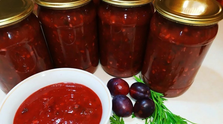 Пропустити через м’ясорубку сливу, помідори, часник, гострий перець, скласти в глибоку чашу або каструлю. Додати сіль і цукор, варити 20-30 хвилин з моменту закипання, періодично помішуючи.