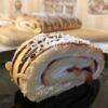 Готовий бісквіт розрізаємо навпіл, я розрізала на 3 коржі. Верх бісквіту піде на крихту.