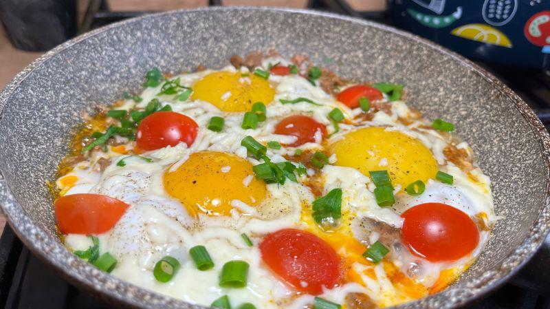 Взагалі, яєчня на сніданок одна з найшвидших і найпростіших страв. Я вирішила доповнити яєчню фаршем, помідорами, сиром та приготувати її дуже ситною.