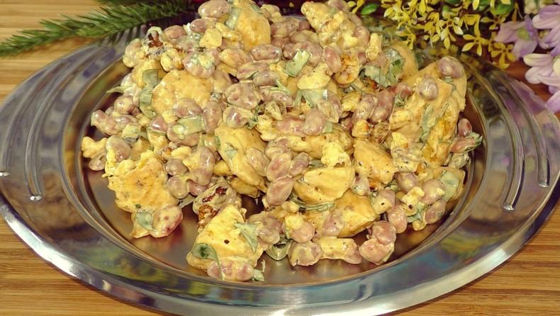 Охолоджену грудку відправити в салатник. Додаємо квасолю.